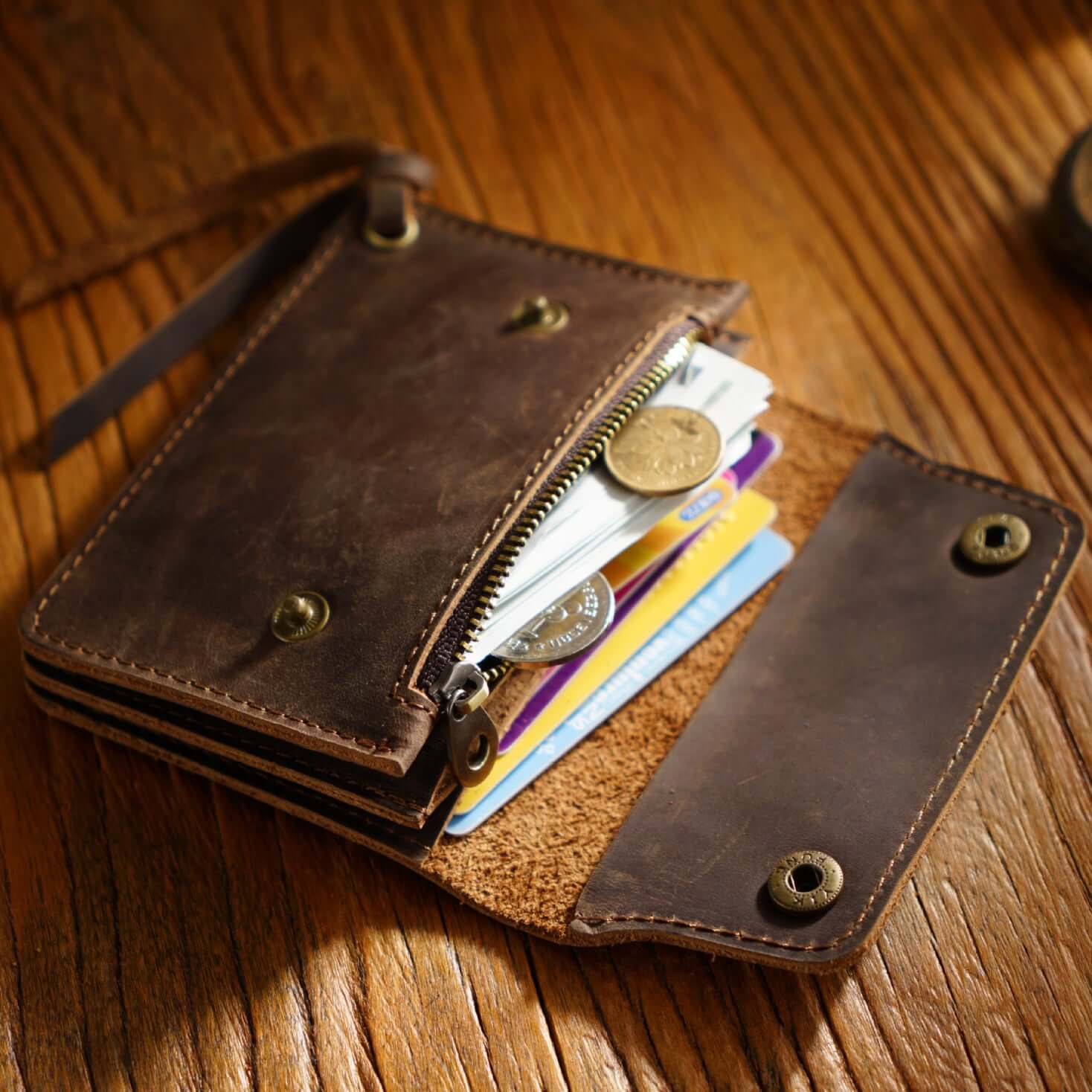 It features multiple card slots and a secure zip pocket, making it ideal for storing cards, coins, and cash.