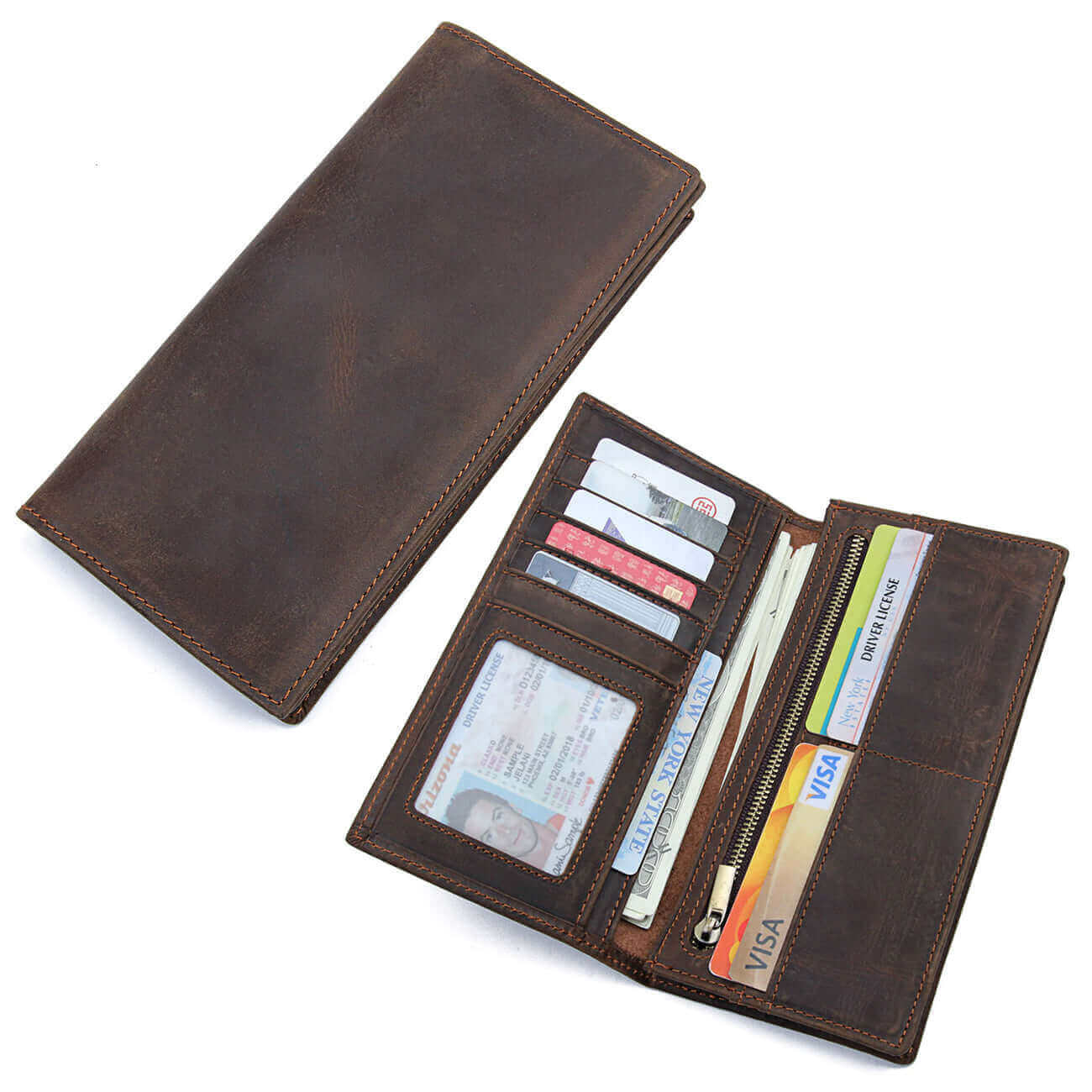 Elevate your style with our vintage genuine leather Long Wallet. This wallet combines a vintage aesthetic with modern functionality. Crafted from genuine leather, it offers a unique, weathered appearance. With 9 card slots, 2 large banknote slots, and various compartments, it's designed to keep your essentials organized.