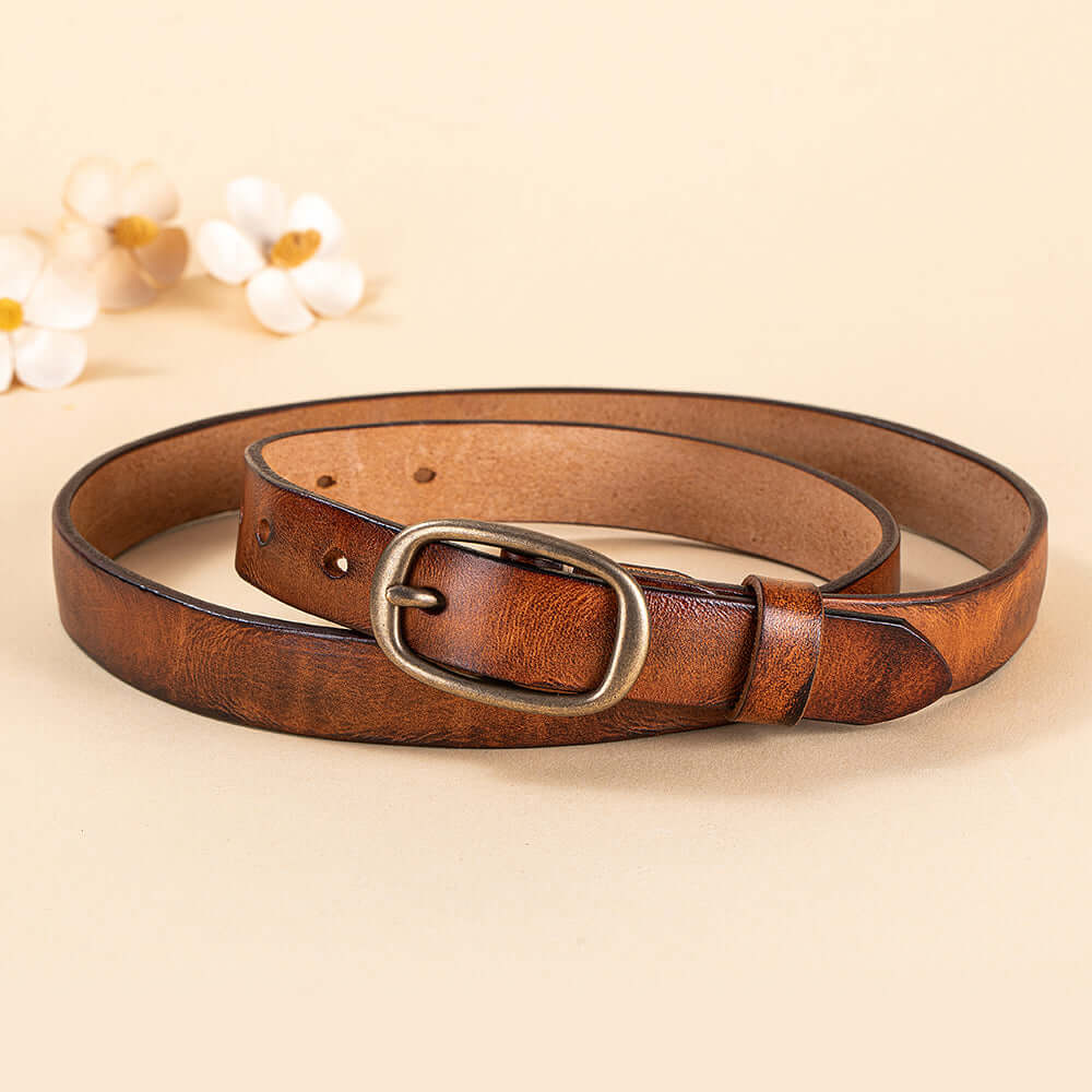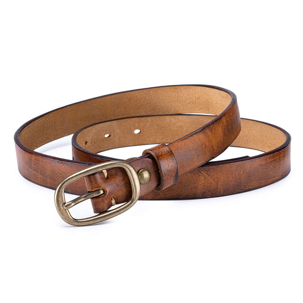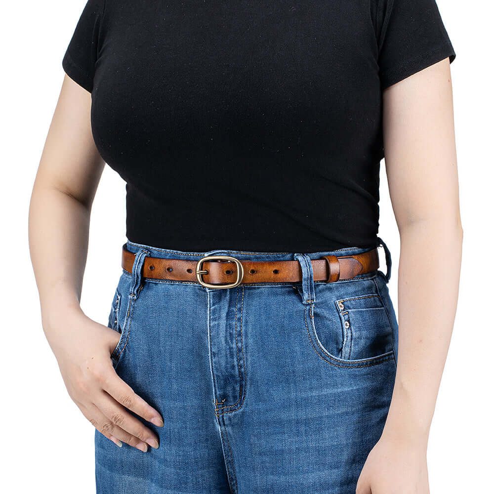 Crafted from premium vegetable-tanned genuine leather, this vintage-style women’s belt features a classic solid brass buckle and a slim elegant profile. Durable yet soft, it’s designed for everyday wear and can be easily adjusted for the perfect fit, making it a timeless accessory for jeans, dresses, or work outfits.
